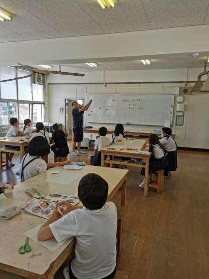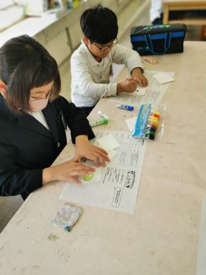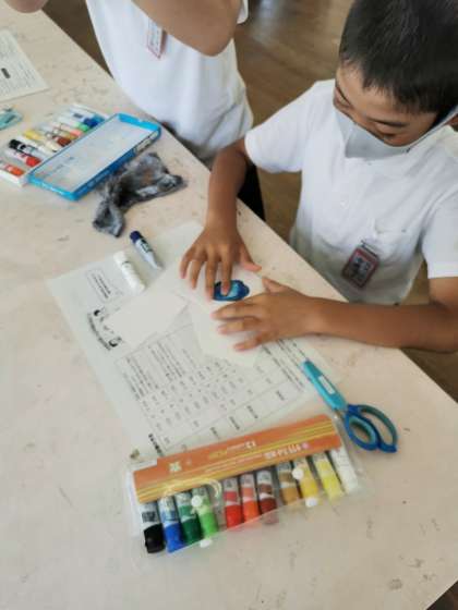 4年生図工では2色の絵の具を使って色の組み合わせをしています。指で色を作る感覚がなかなか新鮮のようです。