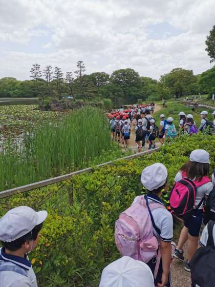 昼食休憩を終えて広い長居植物園をさらに歩きます。大きな池に鯉がたくさんいました。その池の前で写真撮影もしました。
