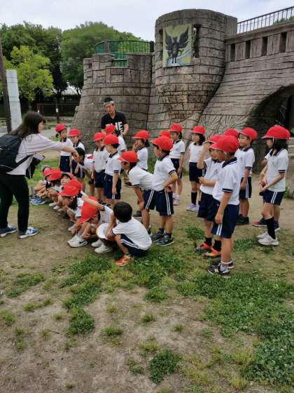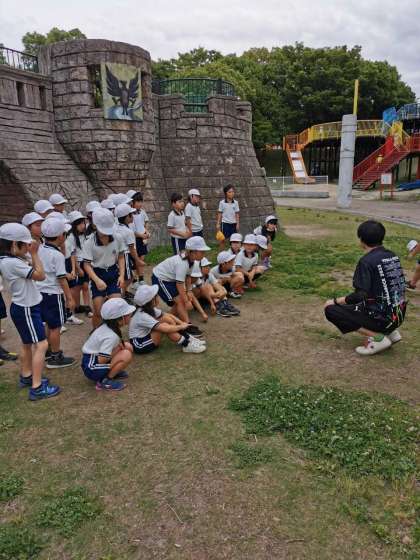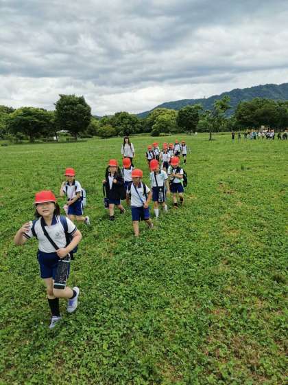 遊具で目一杯遊んだあとは昼食の場所まで移動しました。広い芝生を通りました。