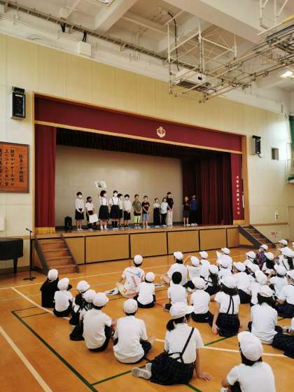 今日の集会は図書委員会の発表でした。6問のクイズがありましたが、図書室をみんなで大切に使ってほしいですね。