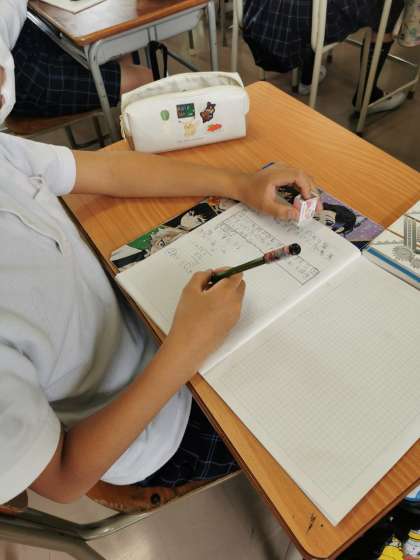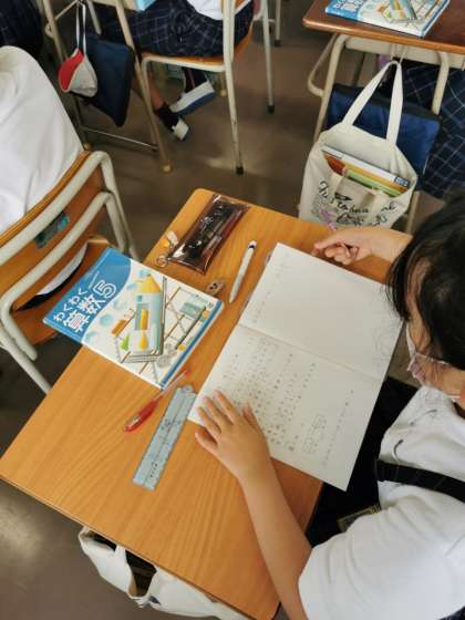 5年生算数。小数の割り算をしていますか、きれいにノートに式をかけている子どもが多いです。