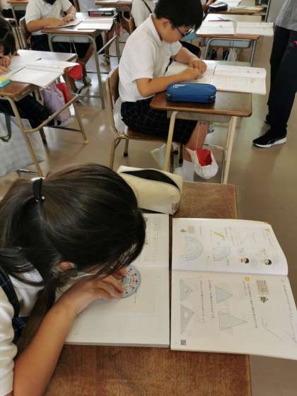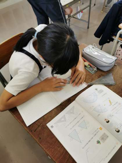 分度器で調べにくい角度をどう工夫するかを考えています。定規を使うなどしている子もいれば、なんとか測ろうと工夫の仕方を考えている子もいました。
