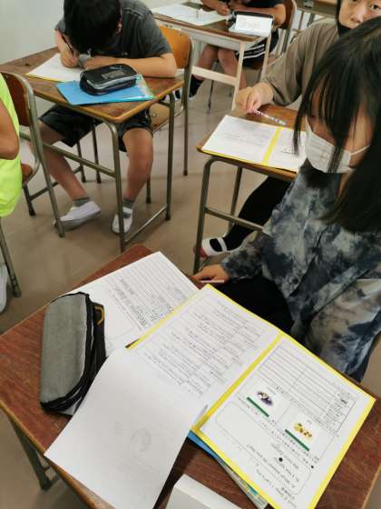 アルファベットで単語や文を書いています。とても集中していました。