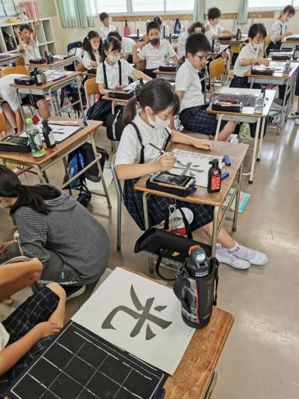 習字で「光」を書いています。お手本のように書けるようがんばっています。