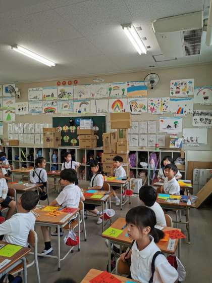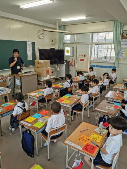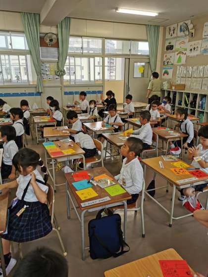 「歌島タワー」の出し物の準備をしています。折り紙にたくさんの絵を描いています。
