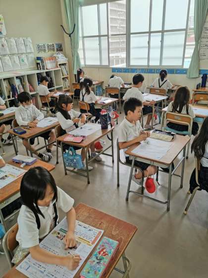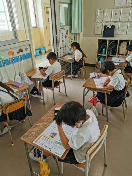 国語のテストをしています。一通り答えたあとしっかり見直ししています。