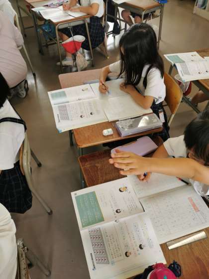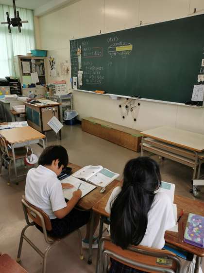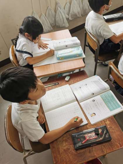□を使った式の学習をしています。ノートに図を描いて考えています。