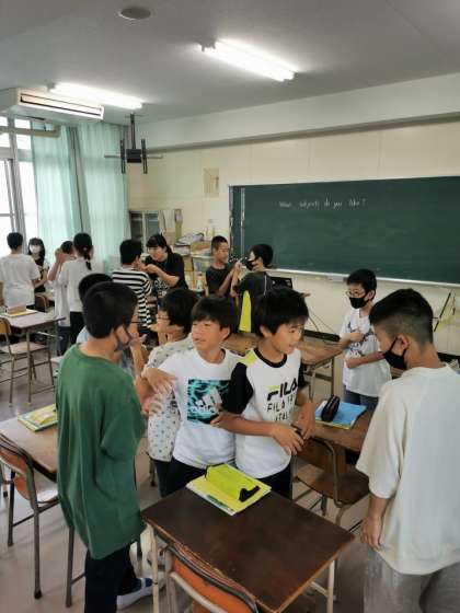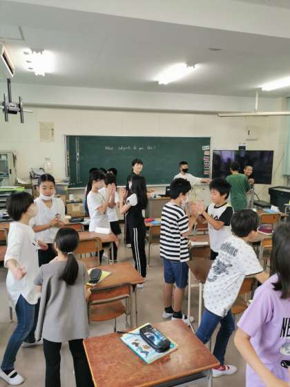 ペアでフレーズを言い合ったり手遊びしたりしています。すごく盛りあがって、活動が終わったあとはあはあと息をしている子どももいました。