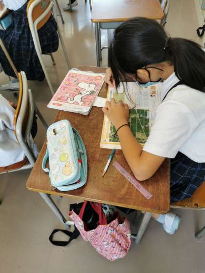 垂直の学習です。垂直な道について、絵図で確かめています。