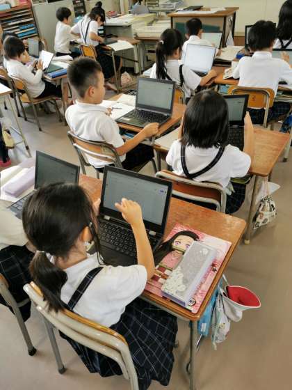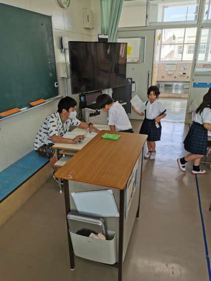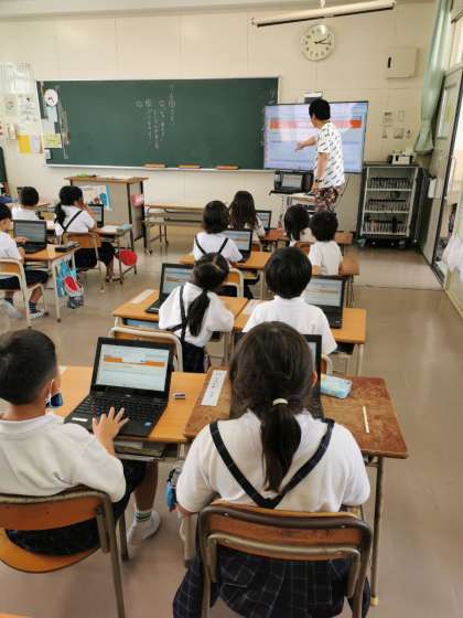 連絡帳を書いたあと、学習者用端末でクラスルーム(学級の掲示板のようなもの)を確認したり、アンケートに答えたりしています。