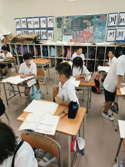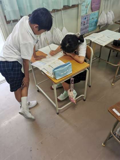 プールに入った次の時間、さっそく算数の学習をしています。教え合いもスムーズに進めることができています。
