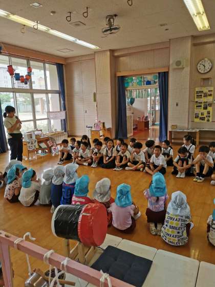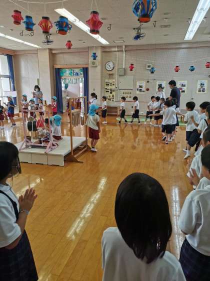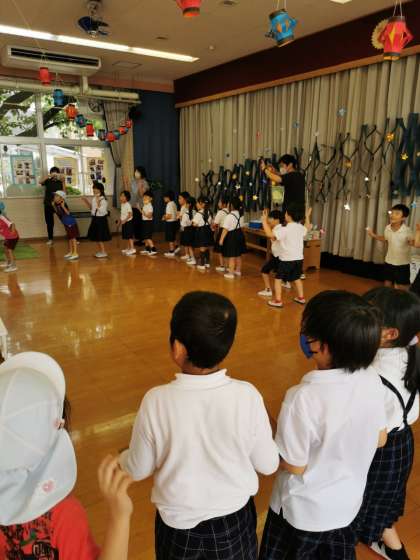 最後はみんなで盆踊りを踊りました。あっという間に野里幼稚園の子どもたちとも仲良くなれました。とても楽しい時間が過ごせて1年生は大喜びでした。また仲良く遊べるといいですね。