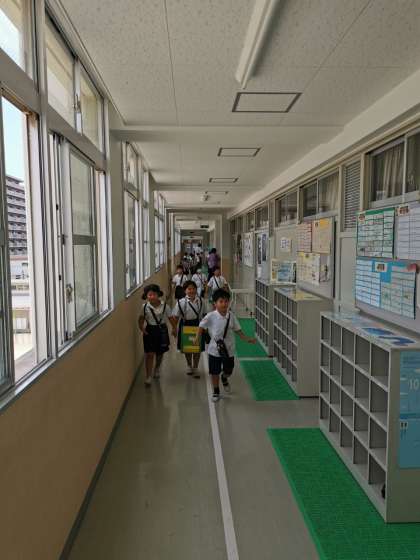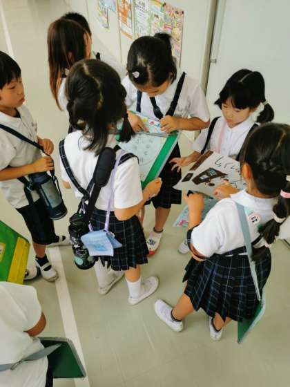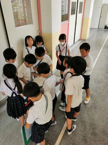 2年生が1年生を校内のいろんな部屋について説明しています。優しく案内してくれています。