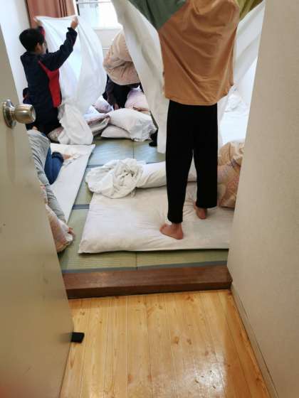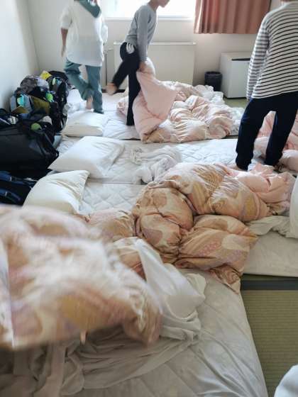 起床の時間になりました。林間学習2日目です。朝の準備中です。