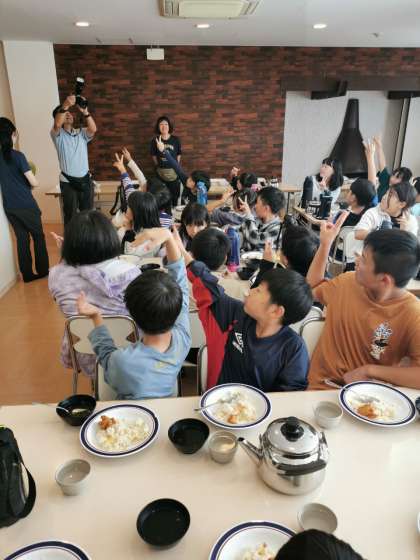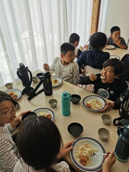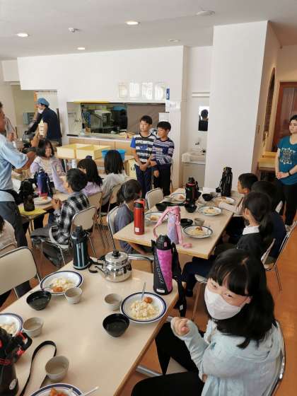 少し休憩のあと昼食。ピラフです。食事係の工夫しての号令でみんなの声がそろいます。