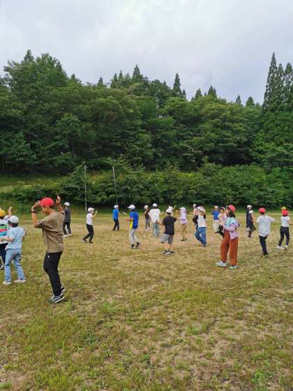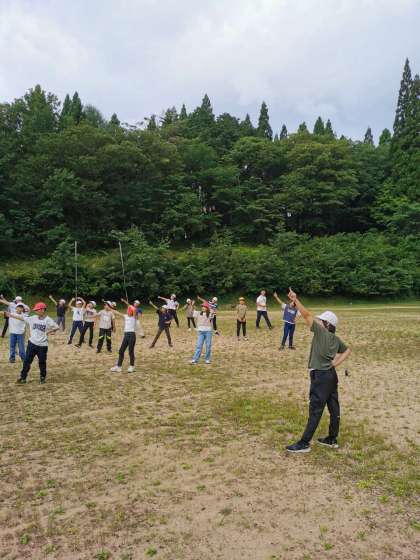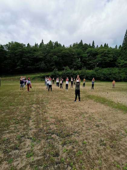 今朝の体操はキャンプファイヤーでやった円盤体操を広い場所で行いました。先生の熱意ある指導がありました。