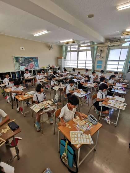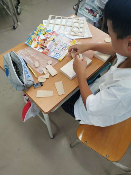 いろんな形の木片を組み合わせて思い思いの形を作っています。