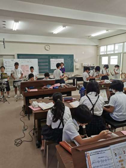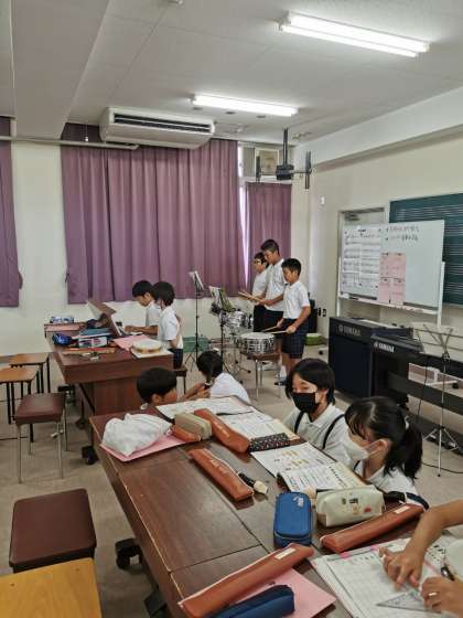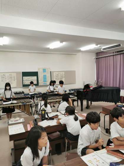 「リボンのおどり」の合奏の練習中です。メキシコ民謡の独特のリズムに合わせようとそれぞれの担当で練習を重ねています。