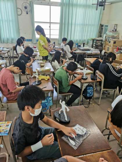 骨組みにつけている紙粘土をていねいに伸ばして切れ目がないようにしています。すごく集中しています。