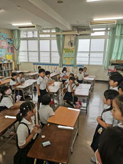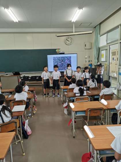 班で見つけたことを感想を交えて発表しています。質問も受け付けています。