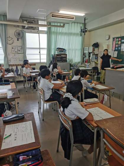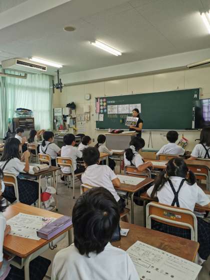 おやつ(甘いもの)のとり方について学習しています。子どもからつい食べすぎてしまうという話も出ていました。西淀川区内の栄養教諭の方に教えていただいています。