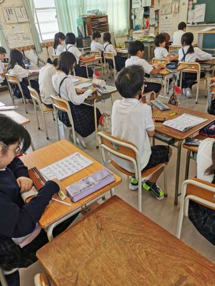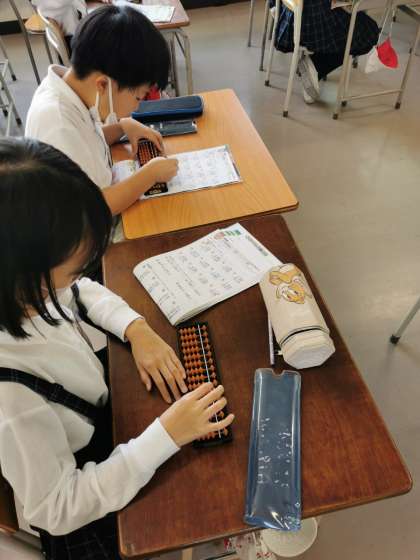 そろばんを使って計算をしています。いつもの筆算とは少し違って、暗算をよくするので頭のトレーニングにもなります。