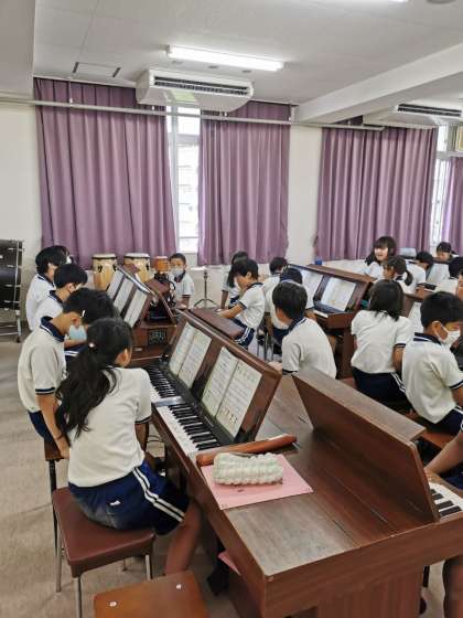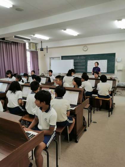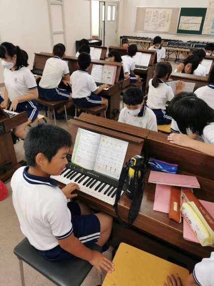 和音をオルガンで弾いています。曲に合わせて、班ごとに分担して弾いています。