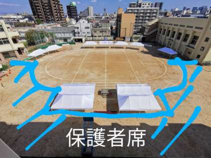 当日の観覧は立ち見になります。トラックの南側が保護者席のゾーンとなります(画像の水色部分)。本部席、トラック、児童席、準備席にはお入りいただけません。また、会場内での場所取りはできません。