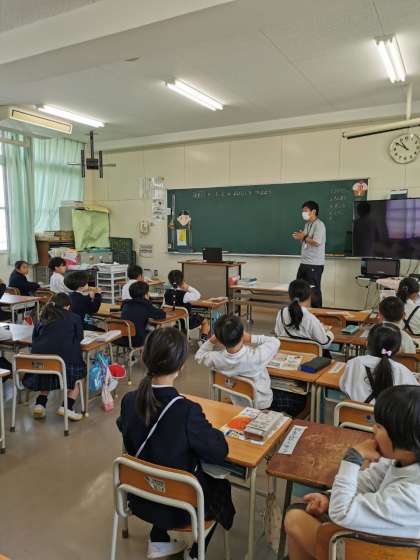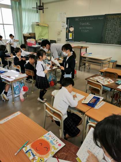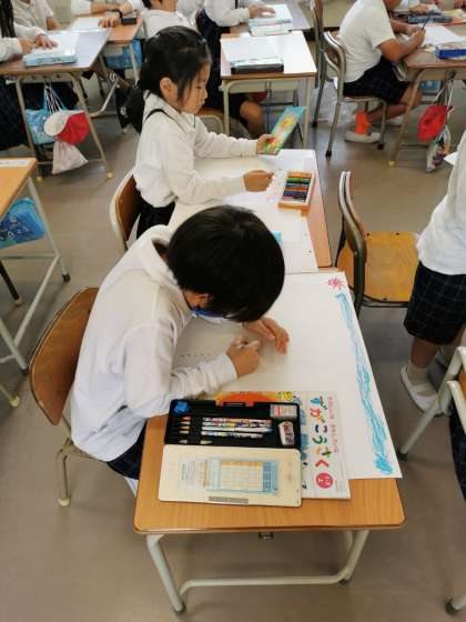 描けた人から、絵の説明を書いています。絵を言葉にするところをがんばっています。また、説明が書けた人はお互いに書いた内容を伝えあっています。