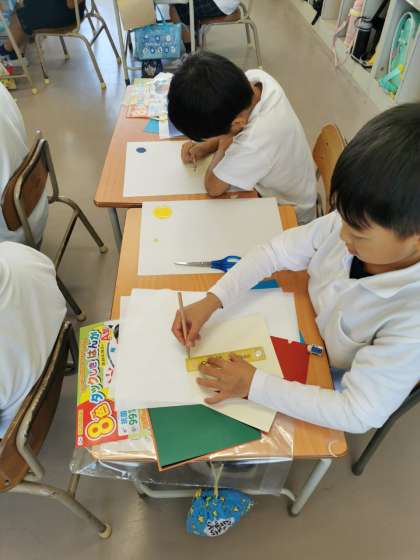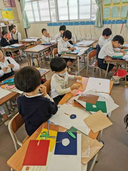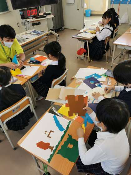 紙版画の制作をしています。細かなパーツを作って思い思いに動物や花などをつくっています。