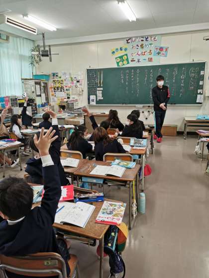 主語と述語の学習をしています。2年生なので複雑ではありませんが、例文でていねいに確認しています。