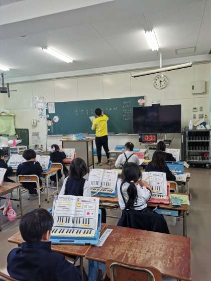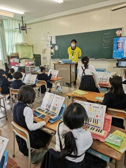 鍵盤ハーモニカで音を出す練習をしています。曲に合わせてできるかな?