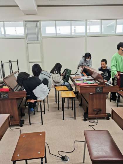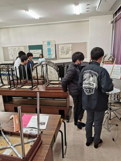 合奏の練習をしています。スパイ大作戦のテーマをいろんな楽器で演奏します。それぞれのパートに分かれて集中して練習しています。