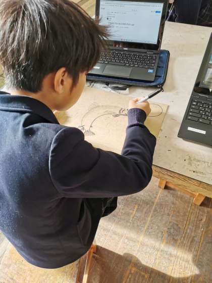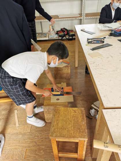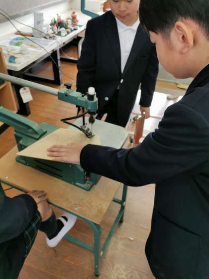 のこぎりや電動糸のこで切っています。安全に気をつけて作業しています。
