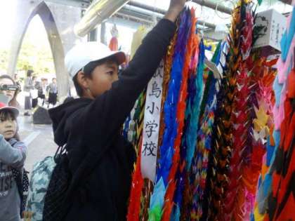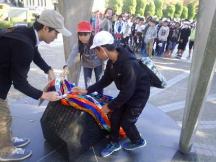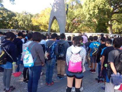平和記念公園内の碑をめぐり、原爆の子の像で黙祷をしました。