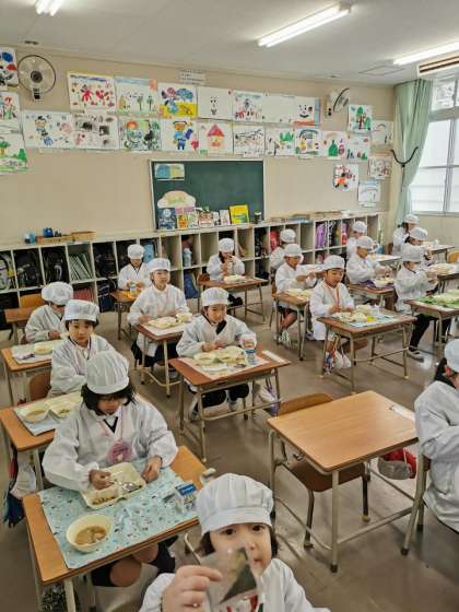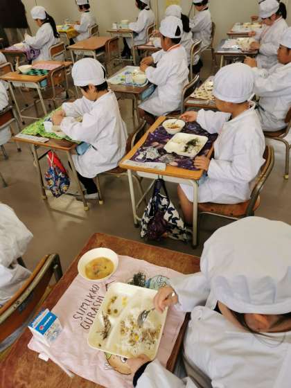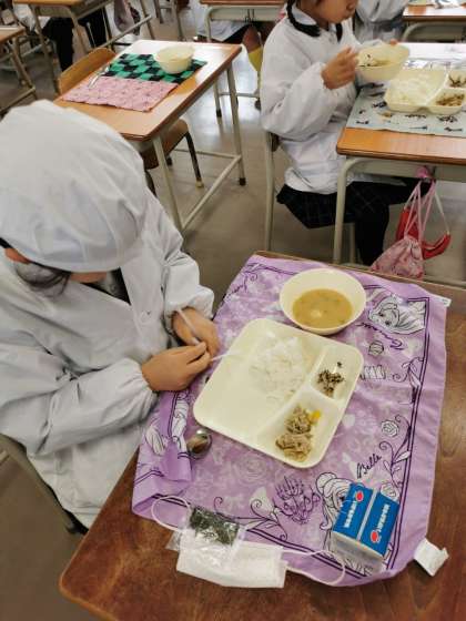 3学期最初の給食です。今日はちらしずしとごまめ、お雑煮をいただきました。ちらしずしの具を混ぜて味わって食べる人もいればそれぞれに分けて食べる人もいました。