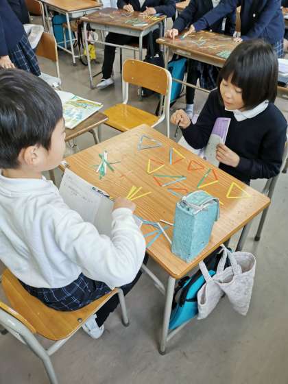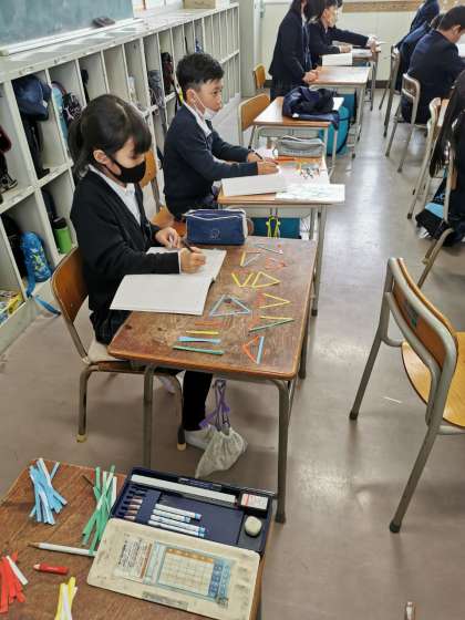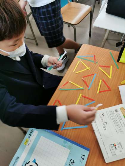 いろんな長さの棒で三角形を作り、仲間分けをしています。なぜその仲間なのかをグループで考えています。
