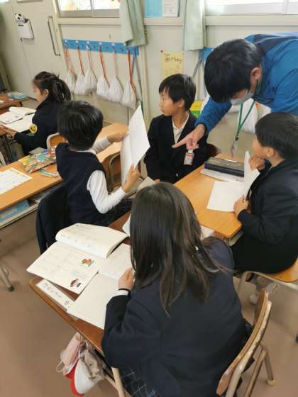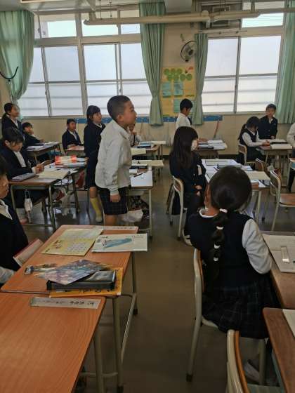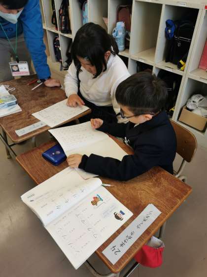 ひらがなとカタカナのにているところと違うところを見つけています。友達と話し合って、見つけたことを発表しています。