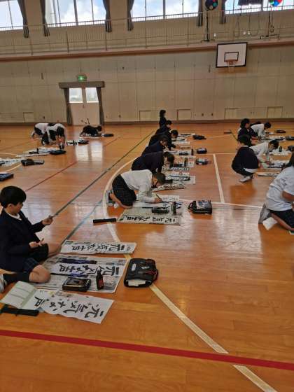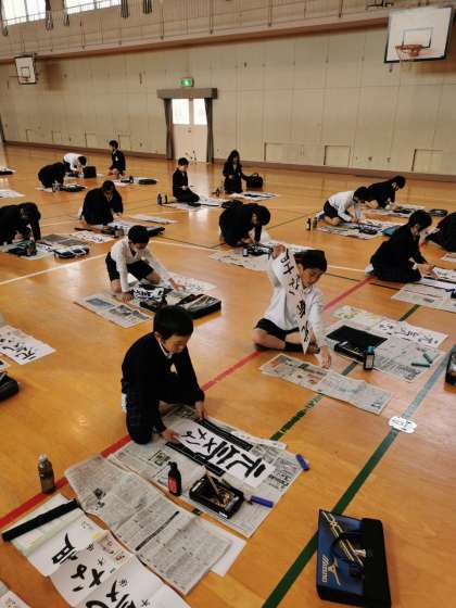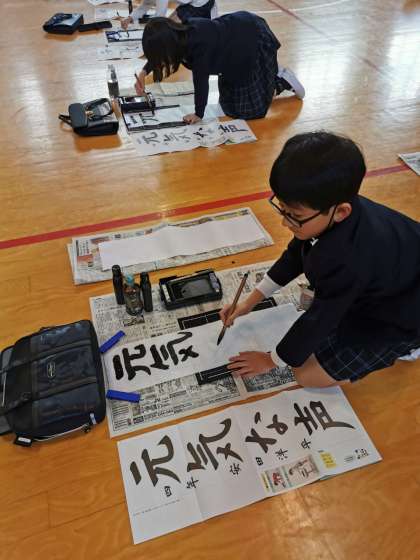 講堂で書き初め大会を行いました。お手本をみて、広い場所で「元気な声」と書きました。