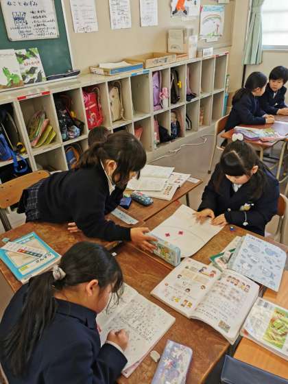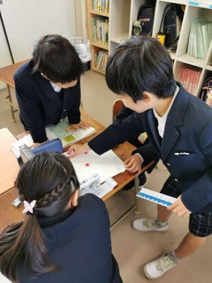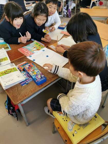 グループになっておはじきで遊んでいます。はじいたところの得点を数えています。上手に計算しています。