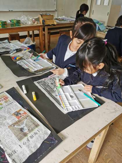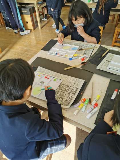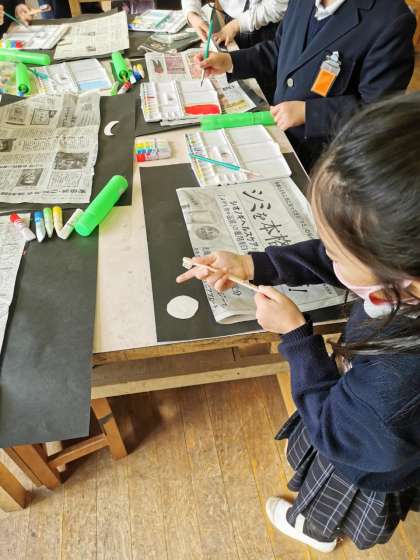 今日はクレヨンスクラッチに、スパッタリングというホウボウで、絵の具で作った色を飛ばして模様をつけました。
