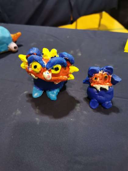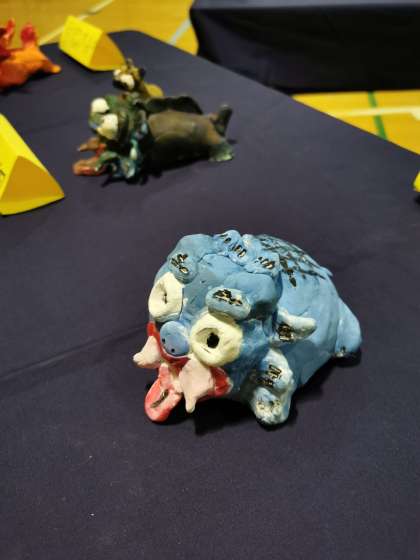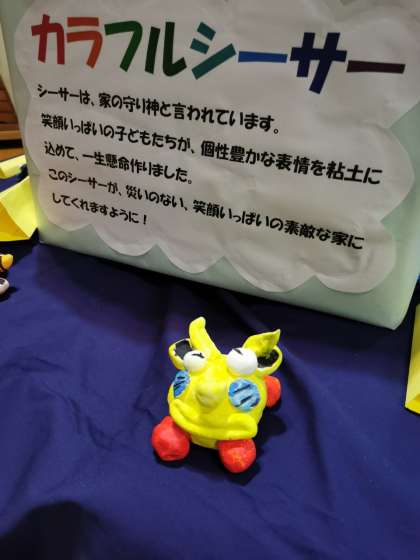 3年生はシーサーを作りました。笑顔がかわいらしいシーサーがたくさんあります。模様やポーズにこだわっている子もいます。