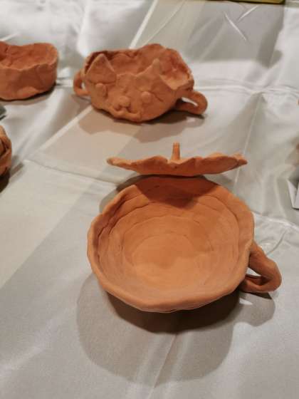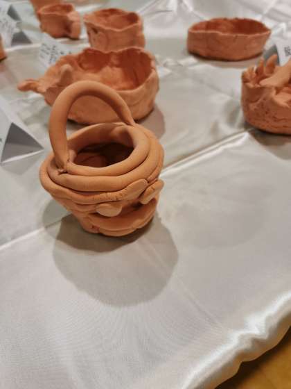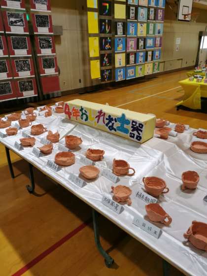 土器を作りました。茶色い土の感じを生かした作品が並んでいます。