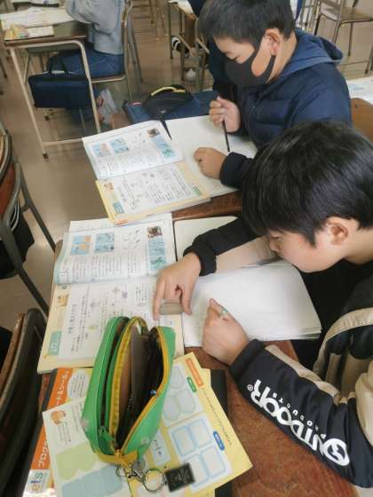 電気、電磁石の学習のまとめをしています。教科書問題を解いています。