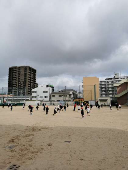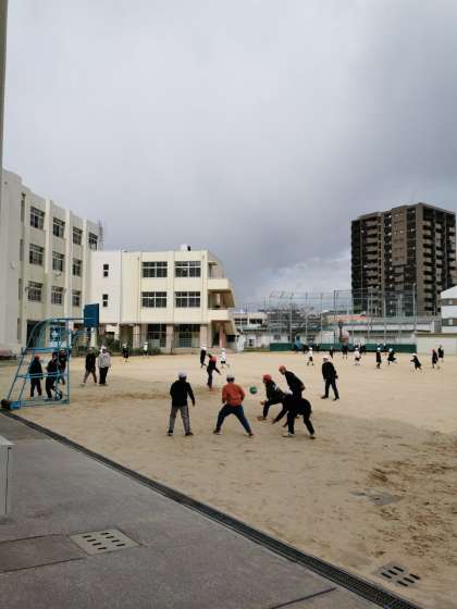 多くの子が運動場で遊んでいます。少し雨もぱらつきましたがみんな元気に遊んでいます。なわとび、ランニング、ドッジボールなどさまざまです。