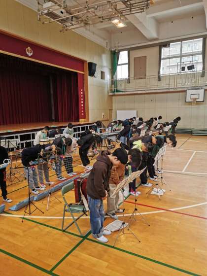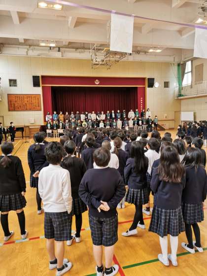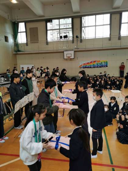 演奏のあと、卒業生から雑巾のプレゼント。終わりにみんなで校歌を歌いました。みんなが揃って歌う最後の曲になります。