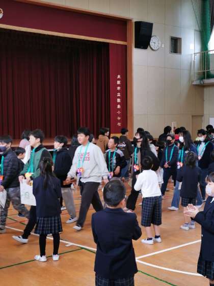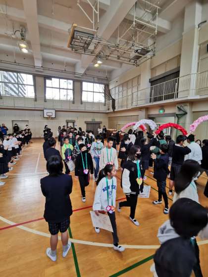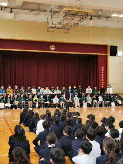 集会が終わりました。ありがとうとおめでとう、拍手がいっぱいの時間でした。講堂から教室に戻る子どもの中には興奮冷めやらぬ様子の子があちこちにいました。本当にいい集会になりました。