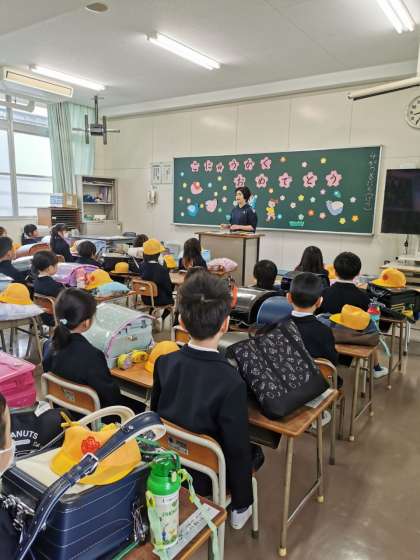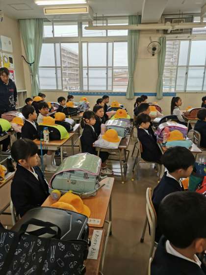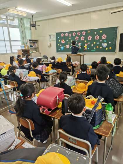 登校後、あいさつをしてからさっそく荷物をどうするかなど学校生活のルールについて話を聞いています。