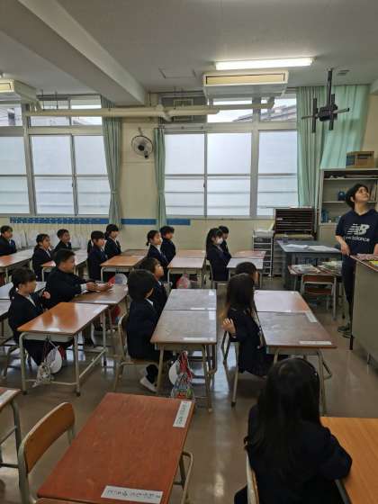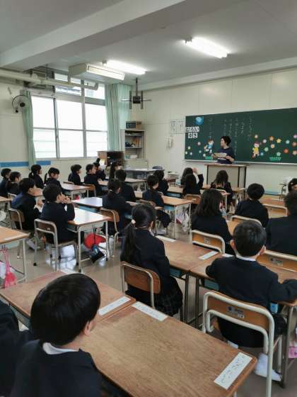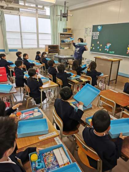 登校してからお道具箱へのしまい方を確認しています。また、お返事など日頃の生活のルールのお話を聞いています。