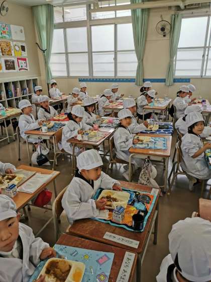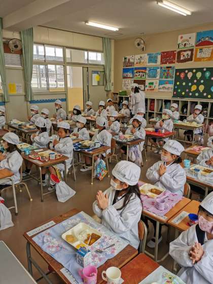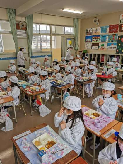 今日の給食は入学お祝い献立ということでカツカレーライスでした。デザートもありました。「おいしい!」「うまい!」など絶賛の声があがっていました。給食調理員さんにも1年生の様子を伝えると喜んでくれていました。